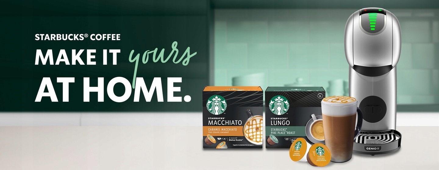 Znane i lubiane Latte Macchiato Caramel serwowane w kawiarniach STARBUCKS. Teraz t? ?agodn?, bogat? w smaku i pysznie znajom? kaw? przygotujesz w domu w ekspresie NESCAF? DOLCE GUSTO.