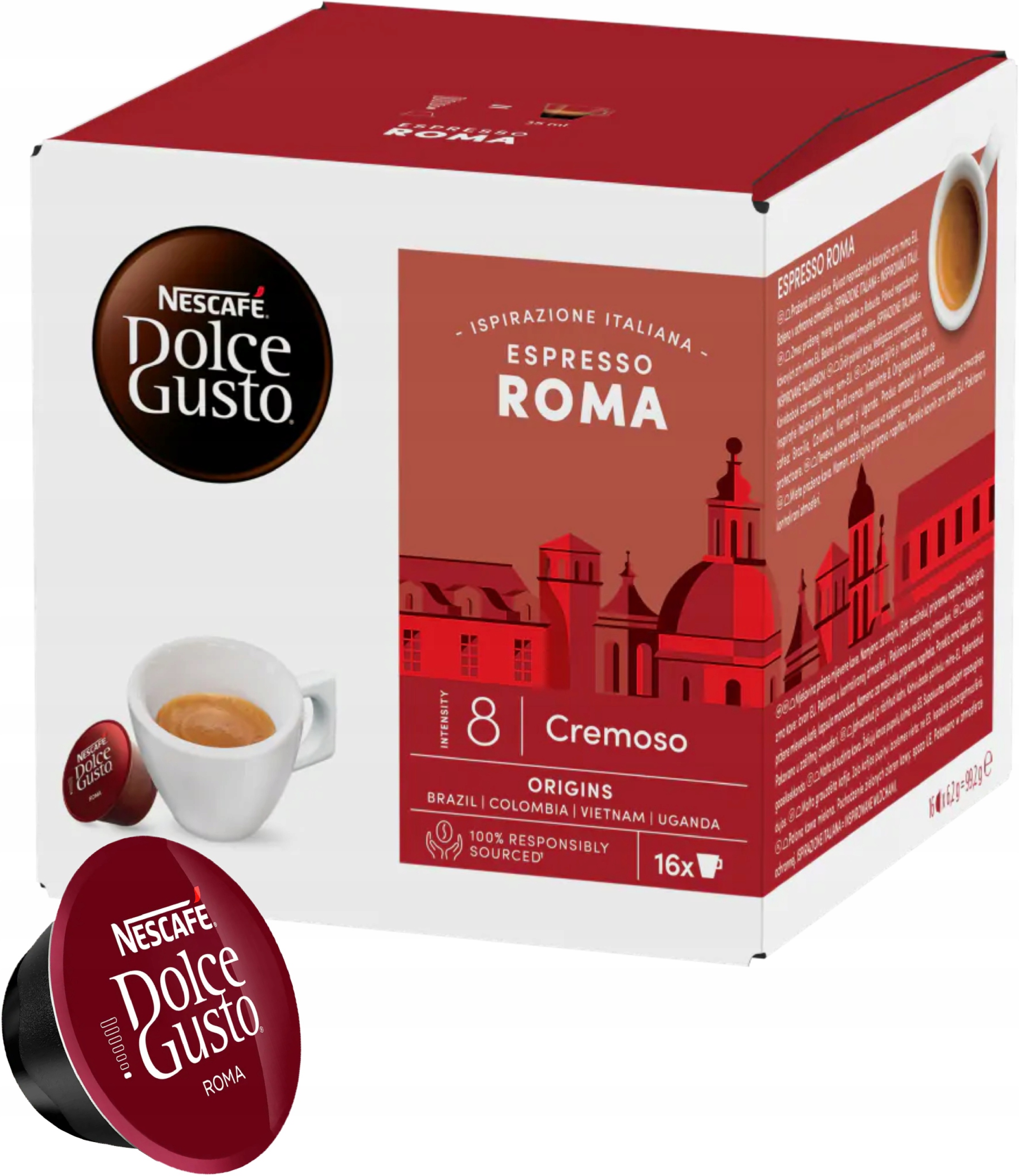 Odkryj ponadczasow? atmosfer? stolicy z bogatym i intensywnym espresso NESCAF? DOLCE GUSTO ESPRESSO ROMA. 5 kaw r??nego pochodzenia, umiej?tnie po??czonych w bogat? i zaokr?glon? kaw? espresso, kt?ra ods?ania aksamitne cia?o z nutami pra?onej czarnej porzeczki. Aromat tego espresso pod g?st? piank? sprawi, ?e poczujesz si? jak w Rzymie.