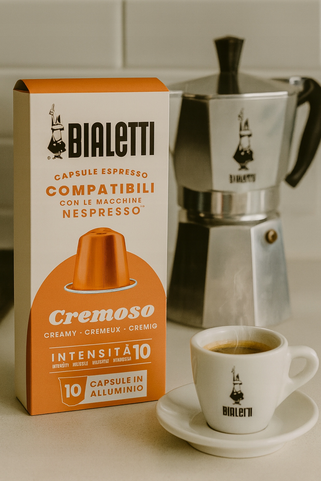 Bialetti Cremoso to kawa w kapsu?kach, kt?ra ??czy delikatno?? i pe?ni? smaku z prawdziwie w?oskim charakterem. Jej sekret tkwi w harmonijnym po??czeniu ziaren arabiki i robusty, kt?re nadaj? naparowi aksamitn? tekstur?, subteln? s?odycz i trwa?? crem?.