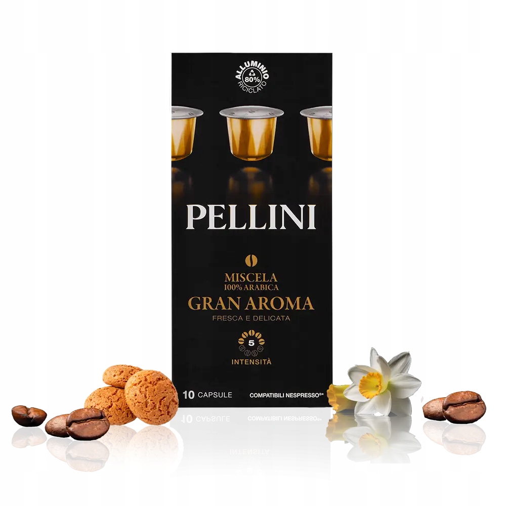 Pellini Miscela Gran Aroma 10 sztuk to zbalansowana kawa w kapsu?kach kompatybilnych z Nespresso?, kt?ra ??czy w?osk? tradycj? z delikatnym i wyrafinowanym smakiem. Idealny wyb?r dla os?b poszukuj?cych kawy na co dzie? ? subtelnej, aromatycznej i eleganckiej.