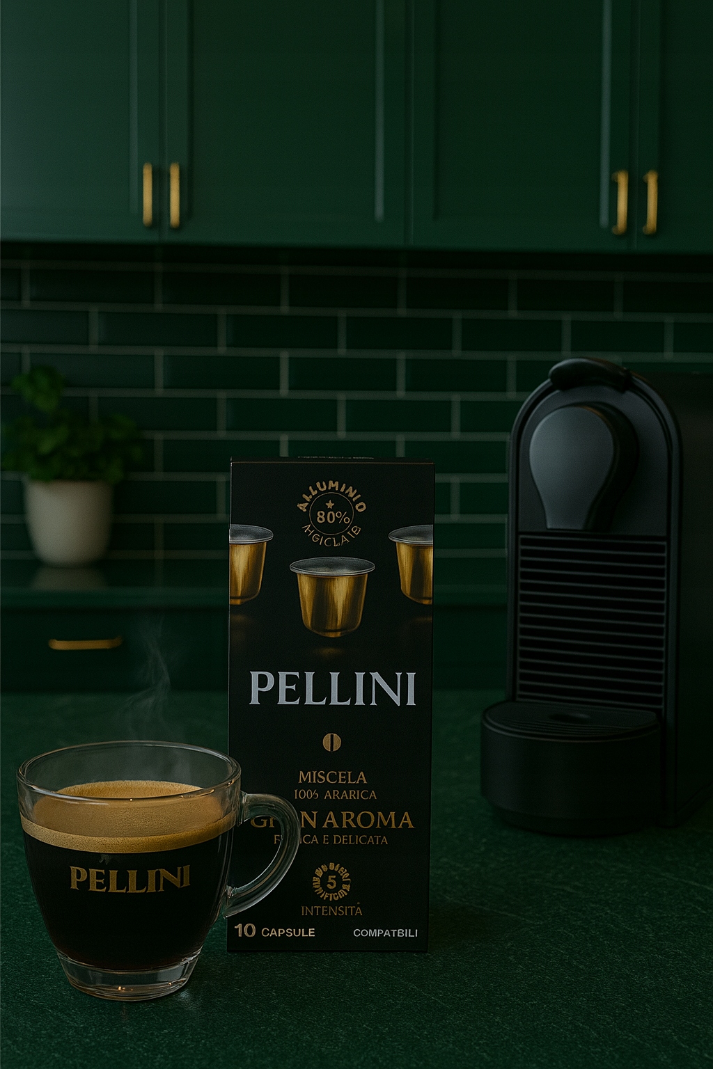 Pellini Miscela Gran Aroma to kawa w kapsu?kach stworzona dla os?b ceni?cych elegancki i zr?wnowa?ony smak espresso. Dzi?ki starannie dobranej mieszance ziaren arabiki, kawa charakteryzuje si? subteln? s?odycz?, lekk? kwasowo?ci? i wyrafinowanym aromatem.
