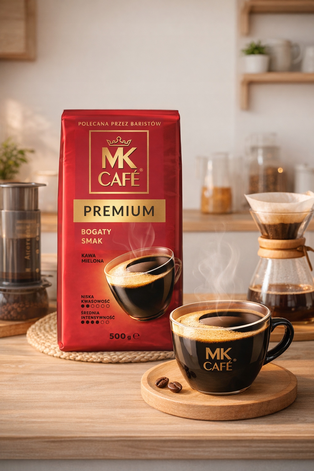 Profil MK Cafe Premium łączy pełny aromat z łagodnym, harmonijnym body, dzięki czemu kawa sprawdzi się zarówno pita na czarno, jak i z dodatkiem mleka czy cukru. Forma mielona pozwala na szybkie i wygodne przygotowanie kawy bez potrzeby użycia młynka, zachowując jednocześnie powtarzalną jakość w każdej filiżance.