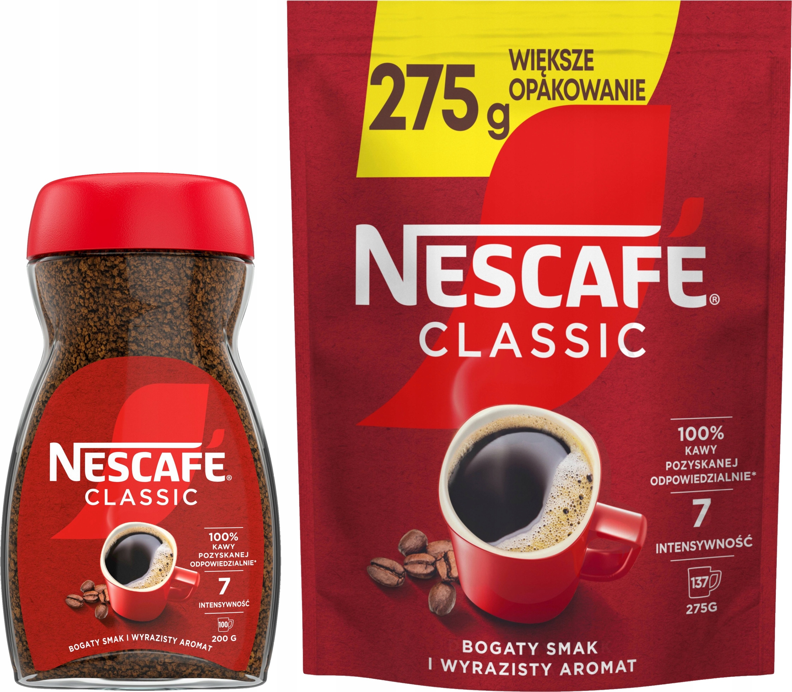 Nescafé Classic to jedna z najpopularniejszych kaw rozpuszczalnych na świecie – ceniona za intensywny smak i charakterystyczny aromat, który dodaje energii o każdej porze dnia. W prezentowanym zestawie znajdziesz dwa praktyczne opakowania: szklany słoik 200 g oraz ekonomiczne opakowanie typu refill 275 g, które pozwala uzupełniać zapasy w sposób wygodny i bardziej ekologiczny.