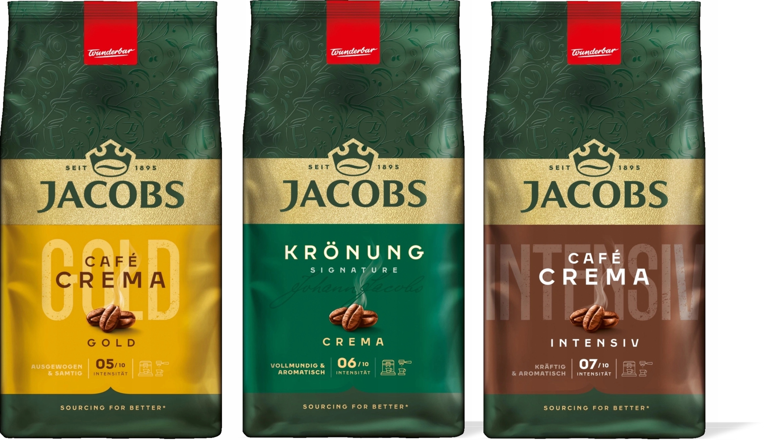 Zestaw 3 × 1 kg kaw ziarnistych Jacobs – Kronung, Crema Gold, Crema Intense