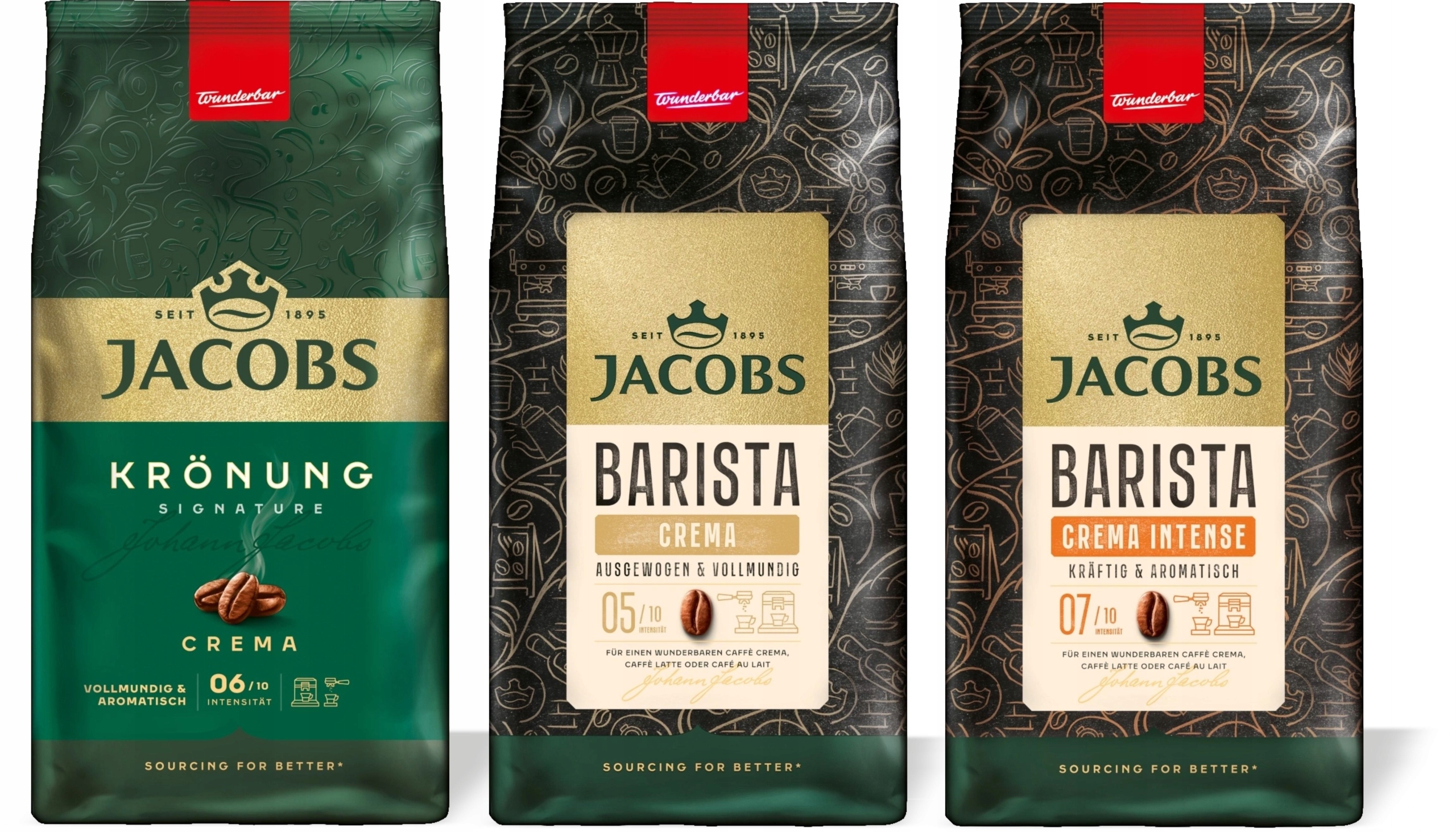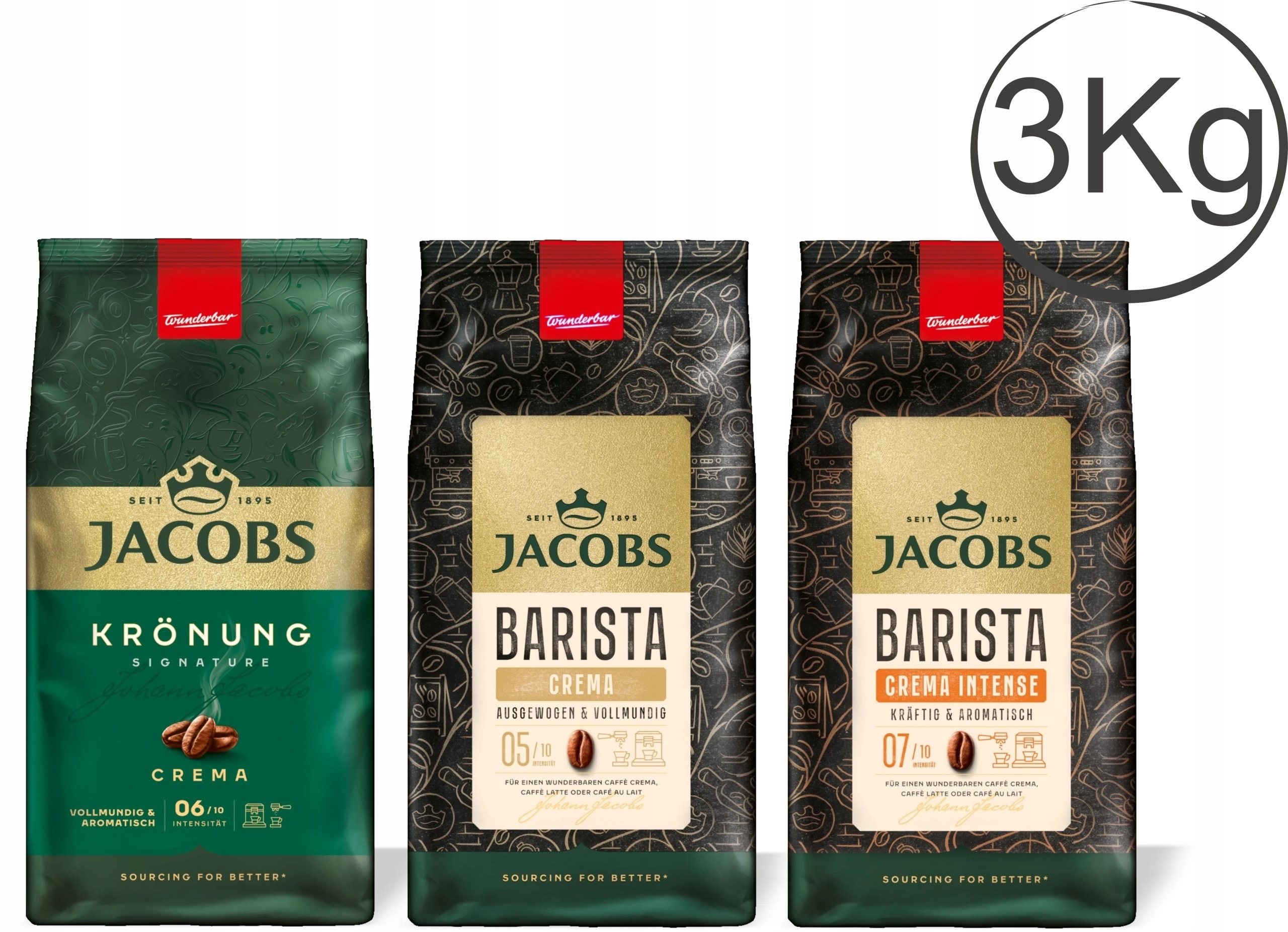 Zestaw 3 × 1 kg kaw ziarnistych Jacobs – Kronung Crema, Barista Crema, Barista Crema Intense