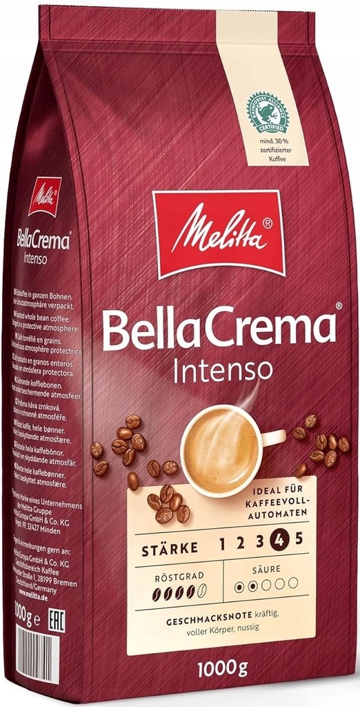Melitta BellaCrema Intenso to kawa ziarnista w opakowaniu 1 kg, stworzona dla tych, którzy szukają zdecydowanego smaku, wysokiej intensywności i aksamitnej cremy, ale bez nadmiernej goryczy. To intensywna mieszanka 100% Arabica, która oferuje idealny balans między siłą a elegancją – doskonała do espresso, ale także do kaw mlecznych.