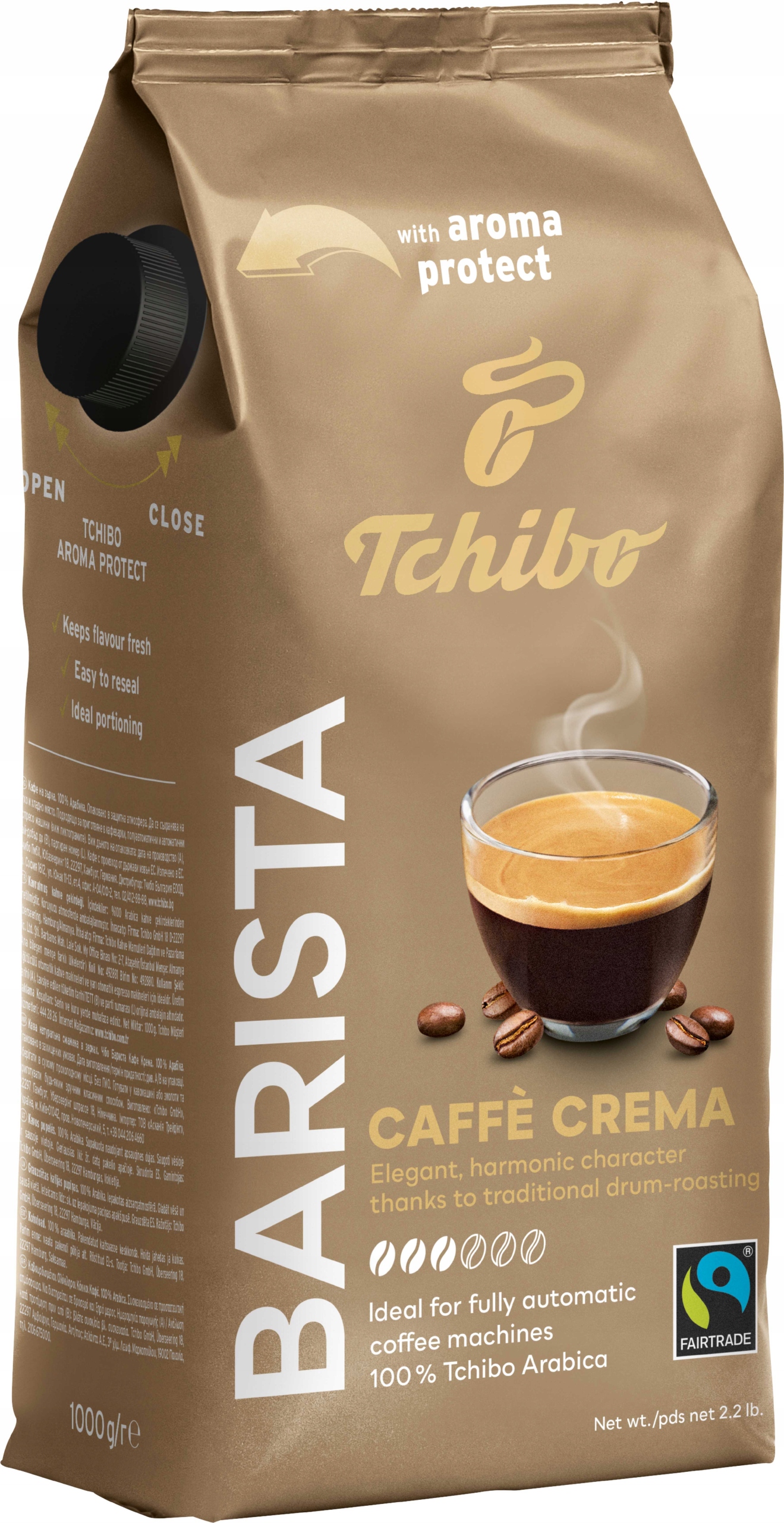 Wybierz Tchibo Barista Caffè Crema – wysokiej jakości kawę ziarnistą stworzoną z wyselekcjonowanych ziaren Arabiki pochodzących z certyfikowanych upraw. Dzięki tradycyjnemu, powolnemu paleniu w bębnie, kawa zachwyca delikatnym, kremowym smakiem i łagodną, złocistą cremą.