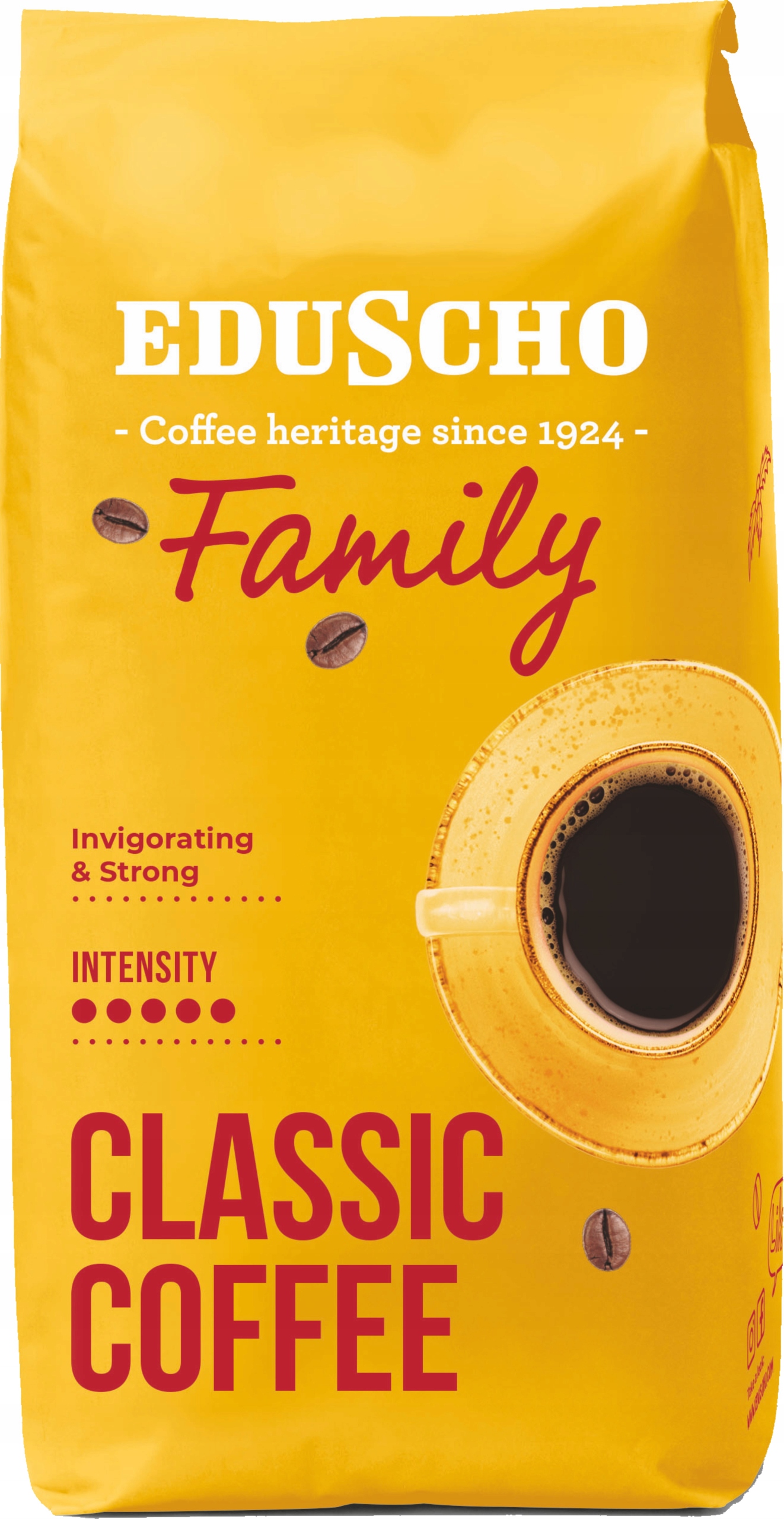 Tchibo Eduscho Family to kawa ziarnista stworzona z myślą o osobach, które cenią sobie pełny, zdecydowany smak i solidną dawkę kofeiny. Ziarna 100% Robusty gwarantują intensywny aromat, wyraźną goryczkę i wysoką zawartość kofeiny, dzięki czemu kawa skutecznie pobudza i dodaje energii na cały dzień.