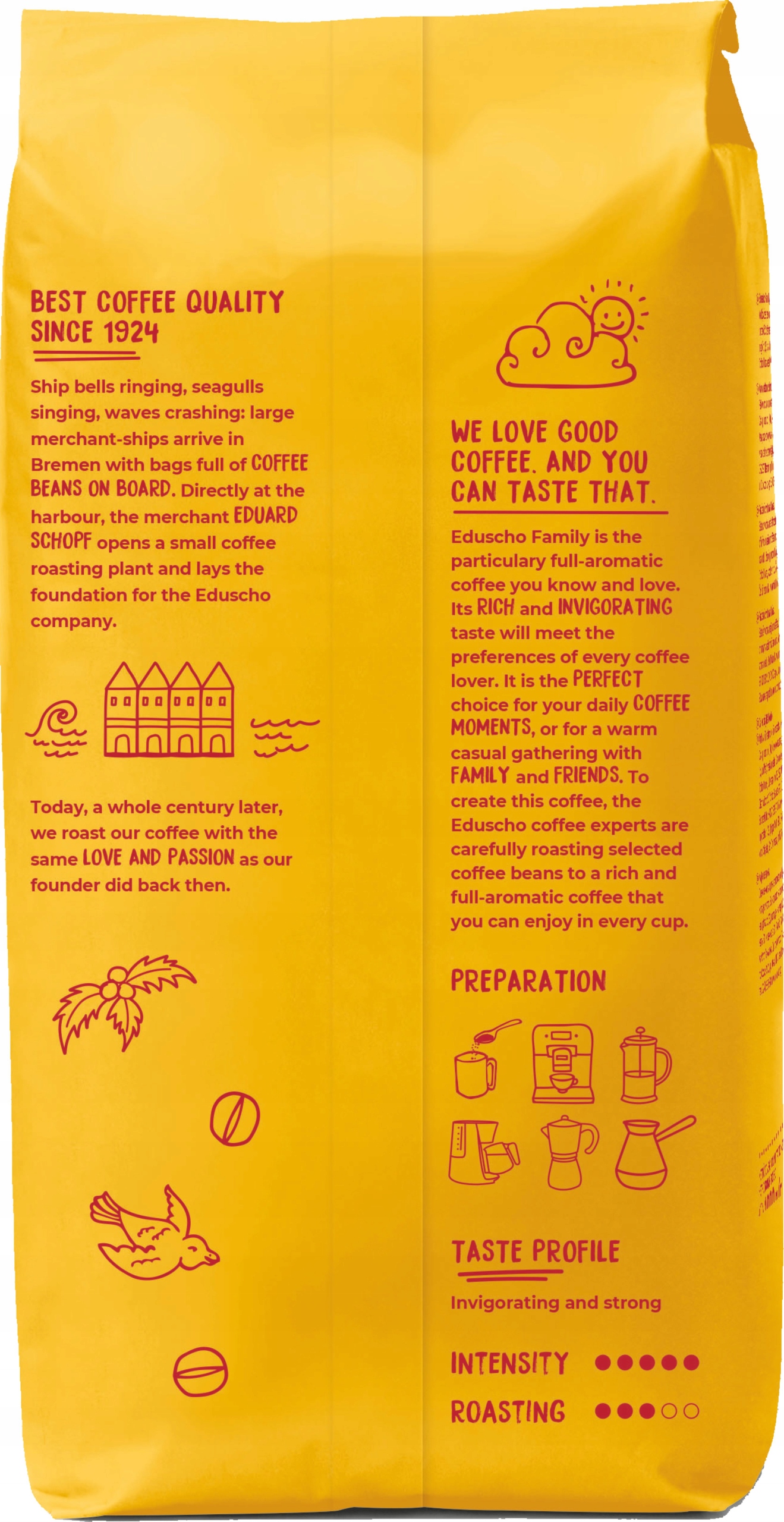Dzięki uniwersalnemu profilowi palenia kawa Eduscho Family doskonale sprawdza się zarówno w ekspresach automatycznych, kolbowych, jak i po zaparzeniu w kawiarce czy tradycyjnie w filiżance. To mieszanka idealna dla osób preferujących mocny, wyrazisty smak, który świetnie komponuje się również z mlekiem.